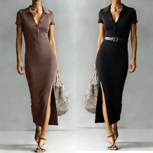 Fashion Stand Collar Button V-neck Short Sleeve Side Slit Ribbed Dress