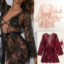 Sexy Three-piece Jacquard Lace Nightwear Set Consist of Self-tie Robe, Brassie and Low-rise Panties