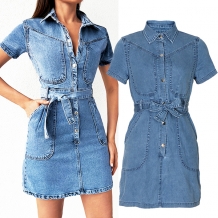 Fashion Lapel Collar Short Sleeve Front Button Self-tie Old-washed Denim Shirt Dress