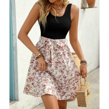 Fashion Square Neck Sleeveless Drawstring Ribbed Spliced Floral Printed Mini Dress
