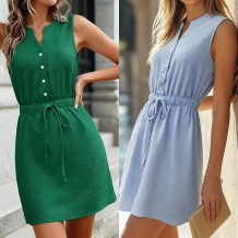 Fashion Button V-neck Sleeveless Elastic Drawstring Waist Mini Dress