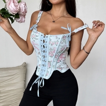 Fashion Floral Printed Bowknot Front Lace-up Corset Crop Top