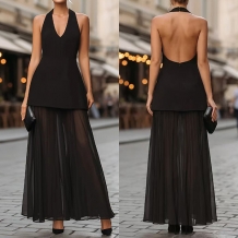 Elegant Two-piece Set Consist of Halterneck Shirt and Gauze Maxi Skirt