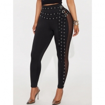 Sexy High-rise Gauze Spliced Skinny Pants with Eyelet Belt