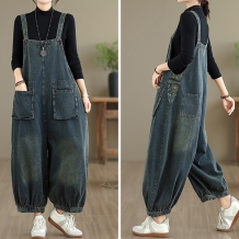 Fashion Adjustable Shoulder Strap Patch Pockets Loose Old-washed Denim Jumpsuit