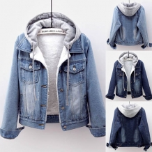 Fashion Long Sleeve Detachable Hooded Plush Lining Denim Coat(The size falls small)