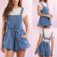 Cute Bow Tie-Back Denim Romper - Summer Open Back Bib Overalls with Pockets