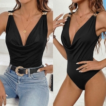Chic Black Cowl Neck Bodysuit with Gold Metal Ring Straps
