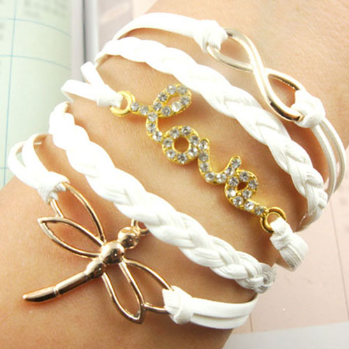 The charm bracelet consists of multi-strand braided faux leather strings in white and a dragonfly pendant,a number"8" pendant and a love pendant fully set with sparkly rhinestones.It has a 1.97" extension chain .