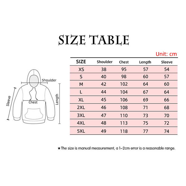 XL : Bust : 104cm(40.94"); Shoulder : 44cm(17.32"); Sleeve : 68cm(26.77"); Length : 67cm(26.38");