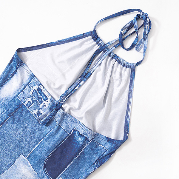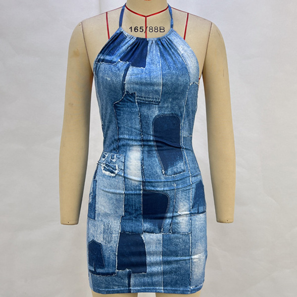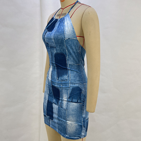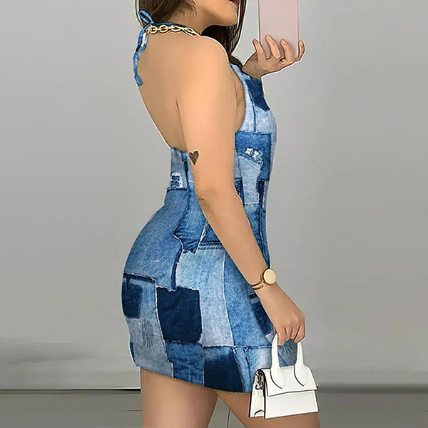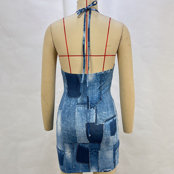 Backless Halter Denim Print Mini Dress Sleeveless Strappy Bodycon Dress with Hip-Hugging Fit