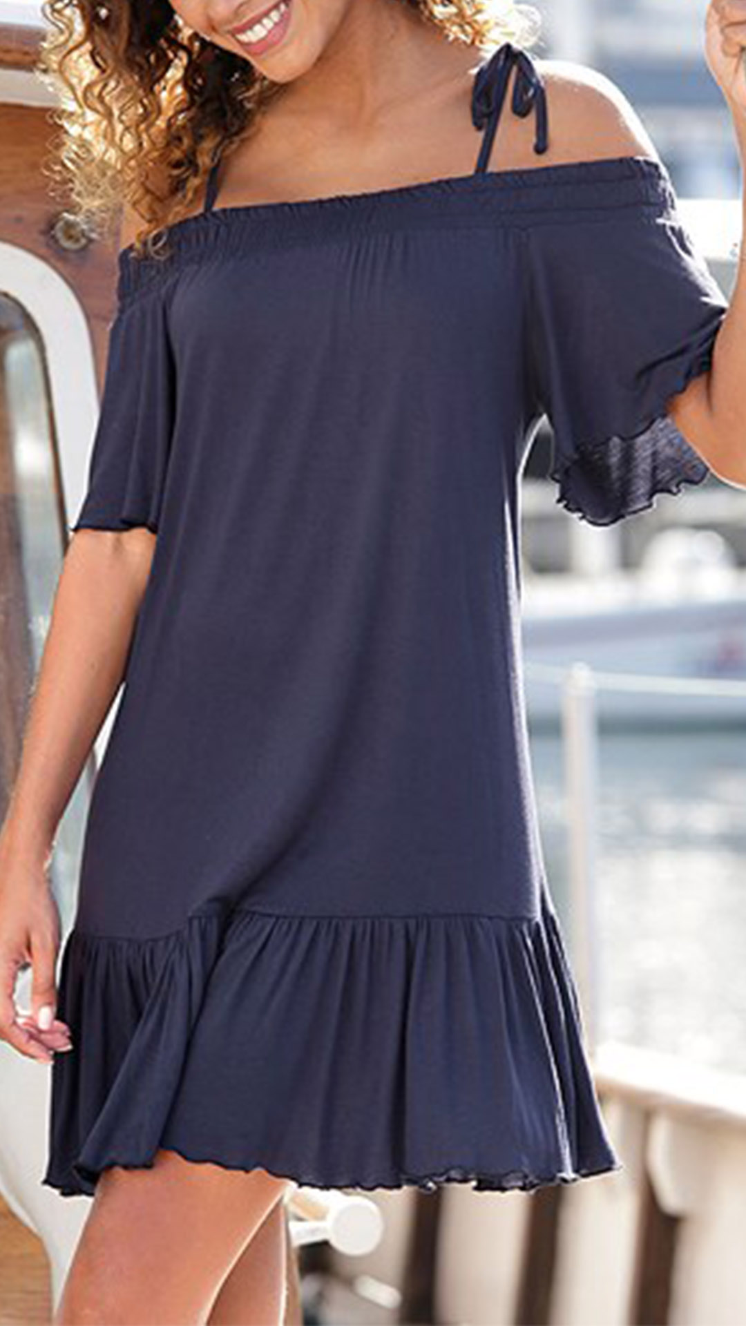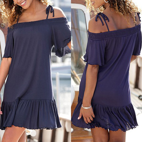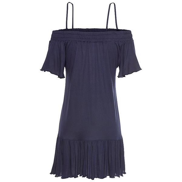 Look at this dress, beautiful off-the-shoulder dress with wide, elastic neckline and spaghetti straps to tie. I like the ruffle hem details, and you?