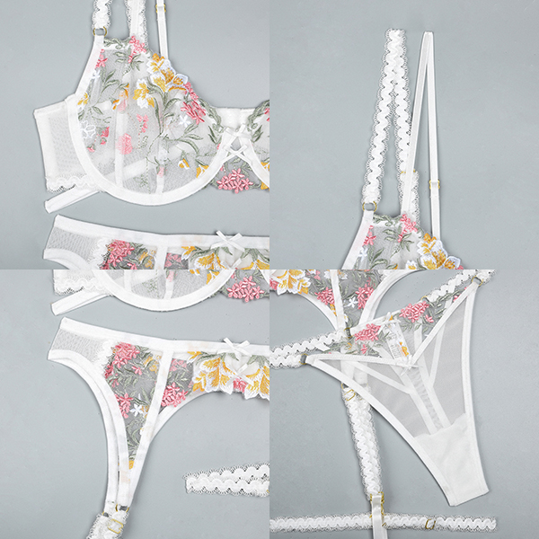 Beautifully Embroidered Floral Lingerie with Double Straps and Intricate Bowknot Detail