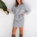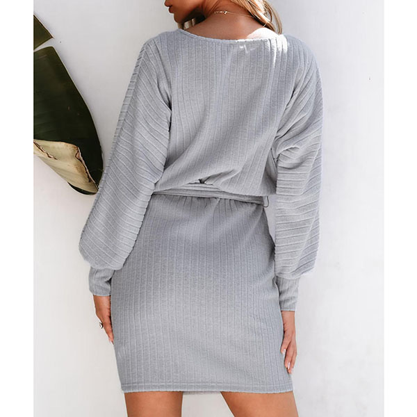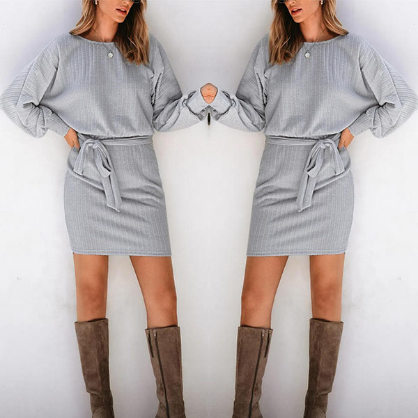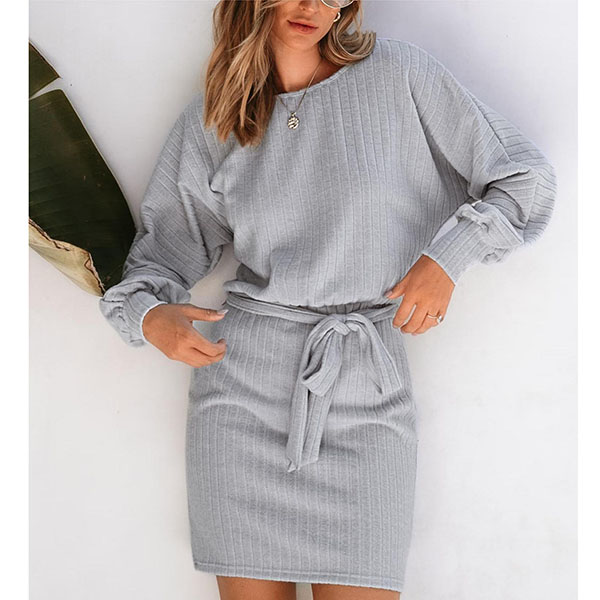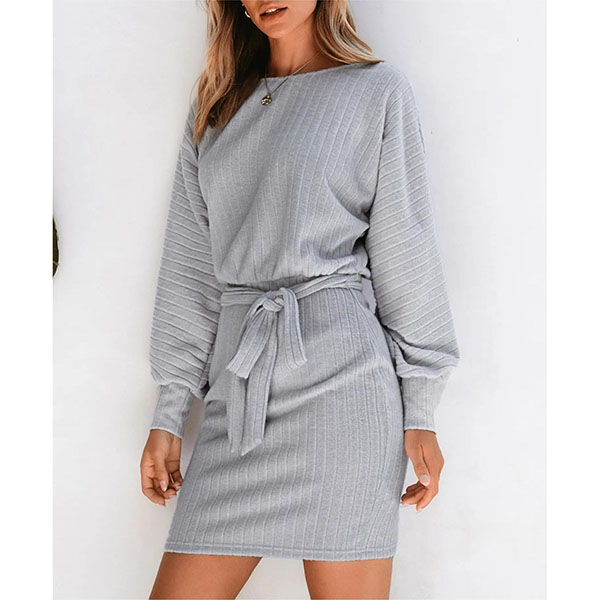 Fashion Crew Neck Long Sleeve Self-tie Ribbed Dress