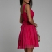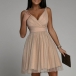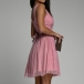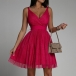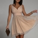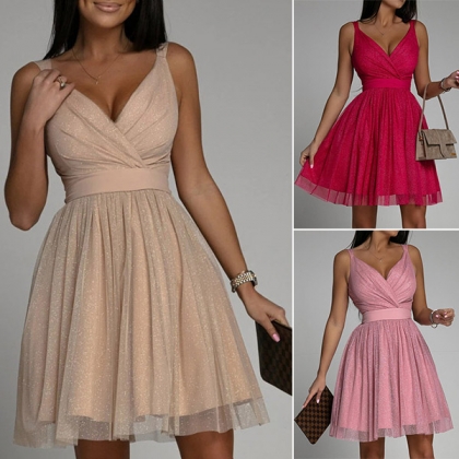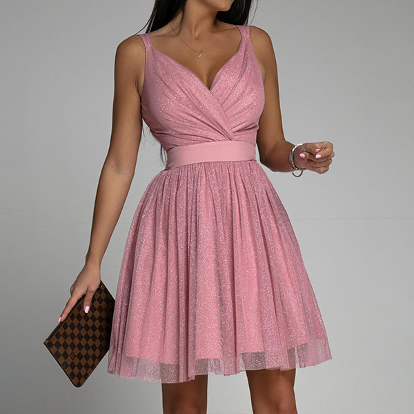 This is a gorgeous party dress that is sure to turn heads! It features a ruched V-neckline, bling-bling gauze spliced, bodycon bodice, and a pleated skirt. It's perfect for a night out on the town or a special event.