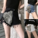 These distressed denim cutoffs features frayed edges and ripped details at the pockets,studded with piles of rivets at the right leg,with one button closure in the front.This piece can make your any outfit incredibly chic.