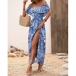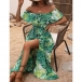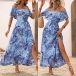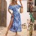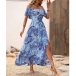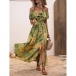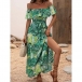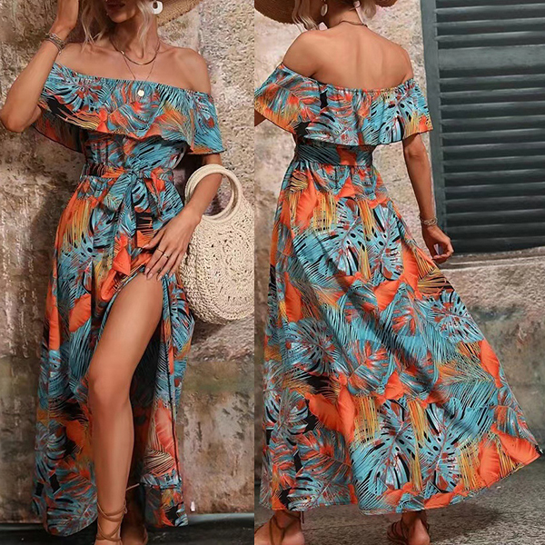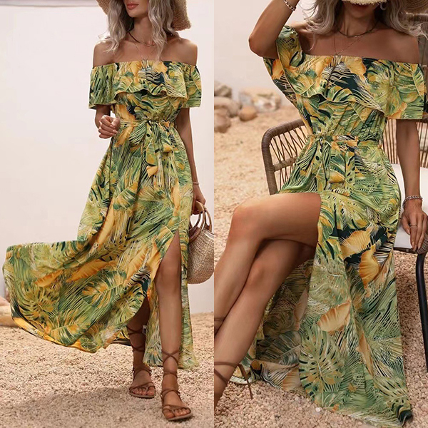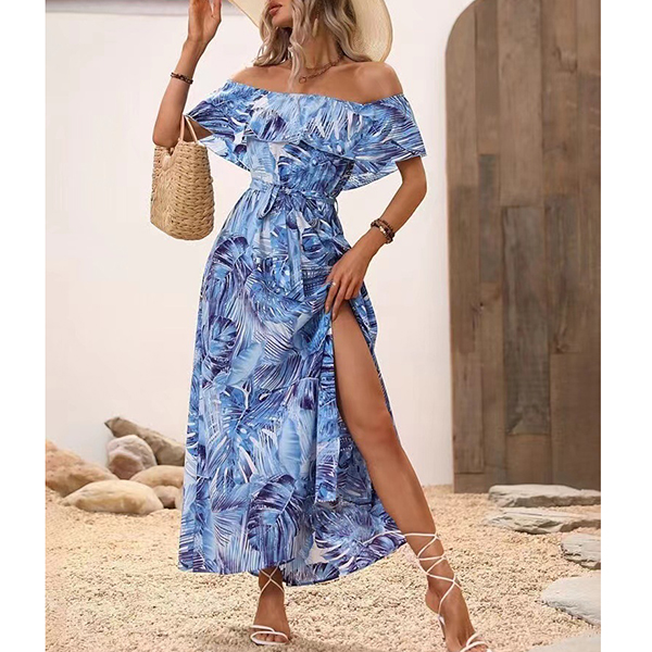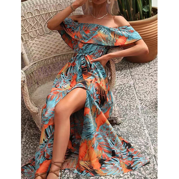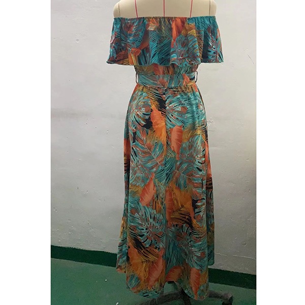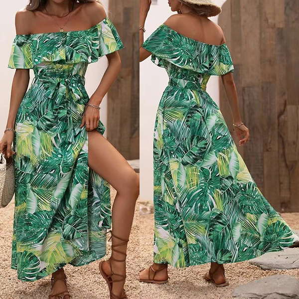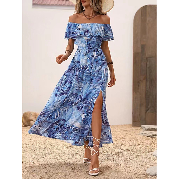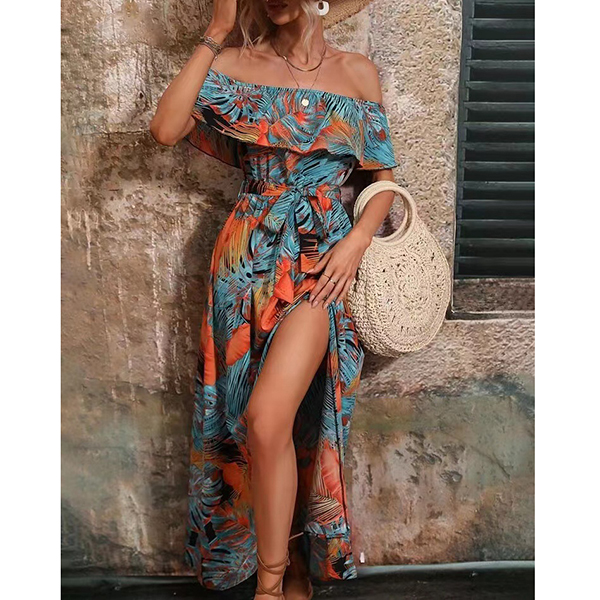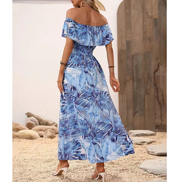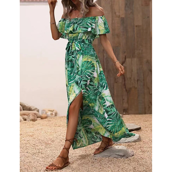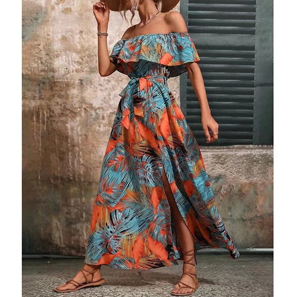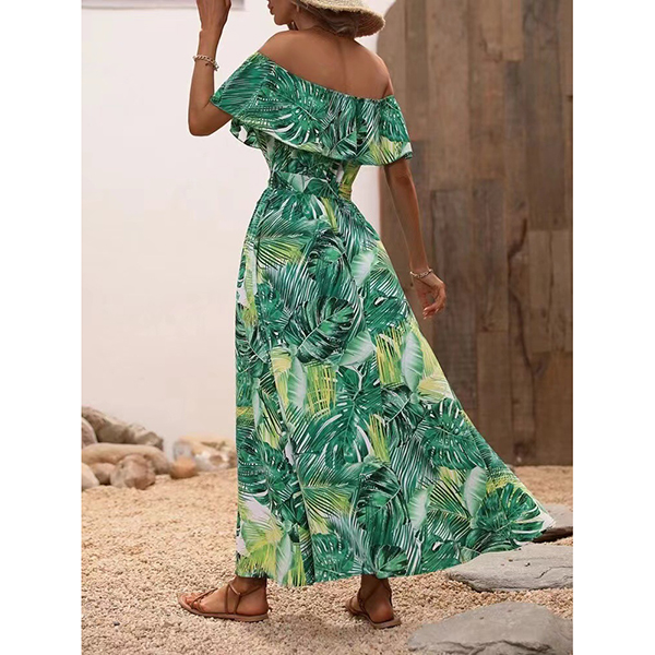 Boat Neck Dress with Decorative Ruffles and Printed Pattern