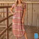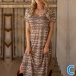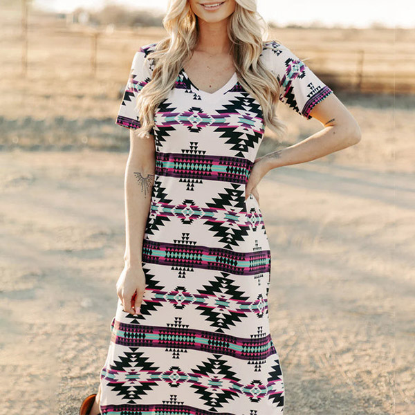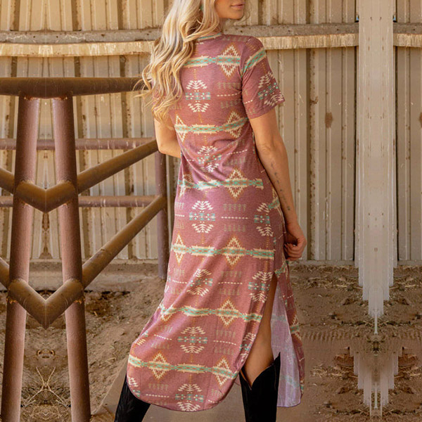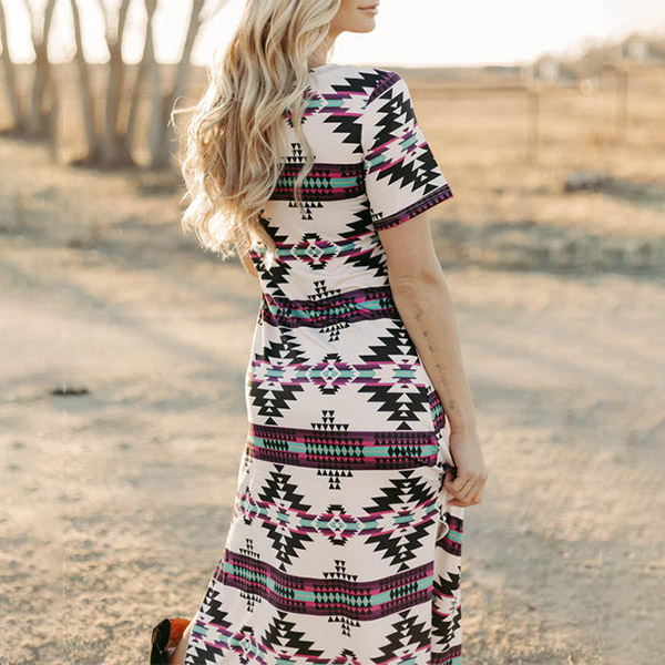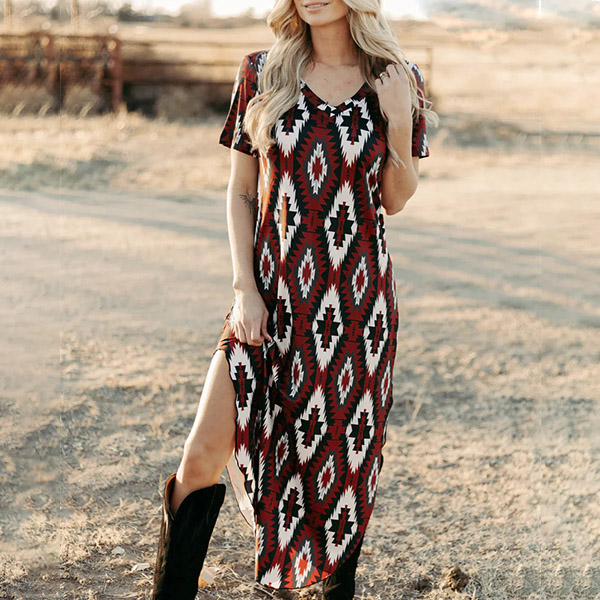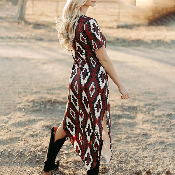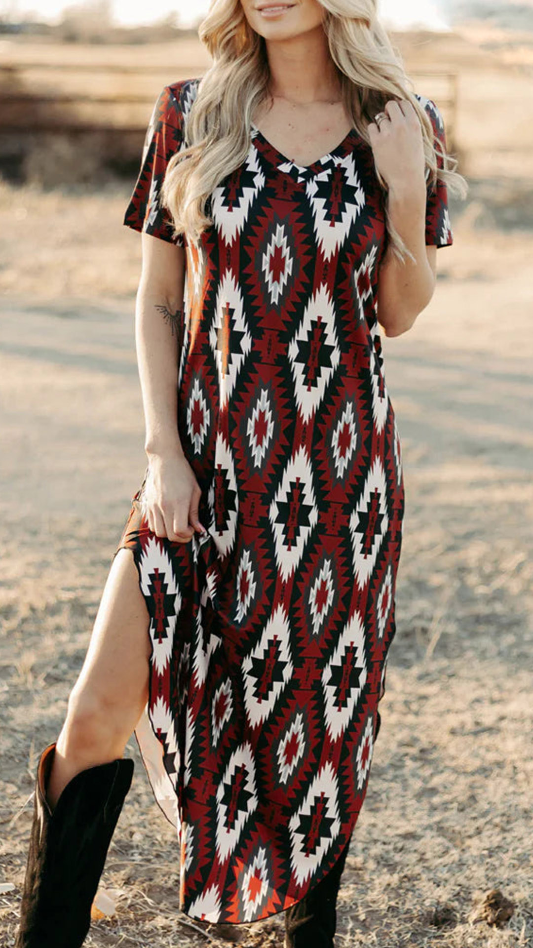 This is a charming and bohemian-inspired dress that combines a diamond pattern, a V-neckline, short sleeves, and a slit detail for a free-spirited and stylish look. Multi-colors available.
