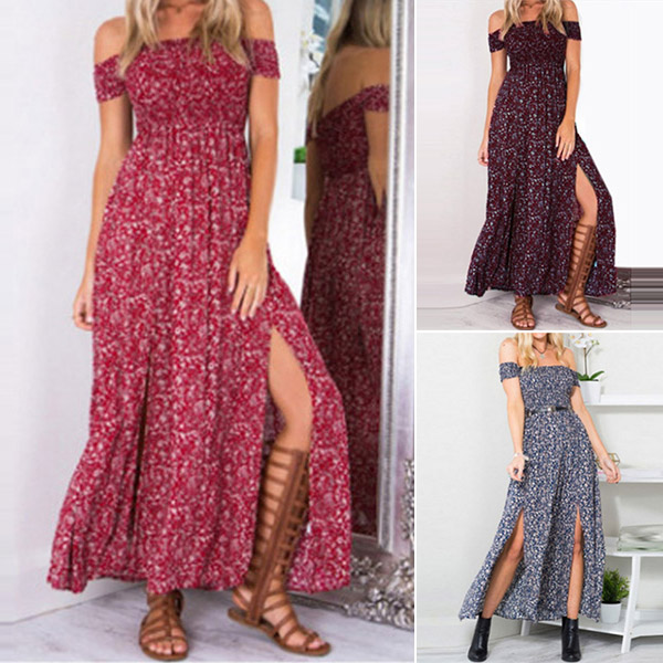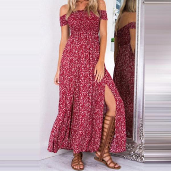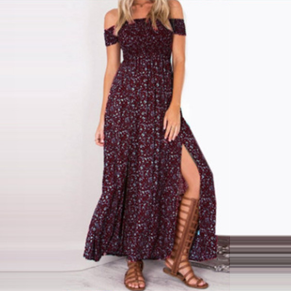 This Bohemia Style Maxi Dress is perfect for any summer event! The light and airy fabric is perfect for hot summer days, and the flattering off-the-shoulder neckline and thigh-high slit add a touch of glamour. Four colors are avaible.