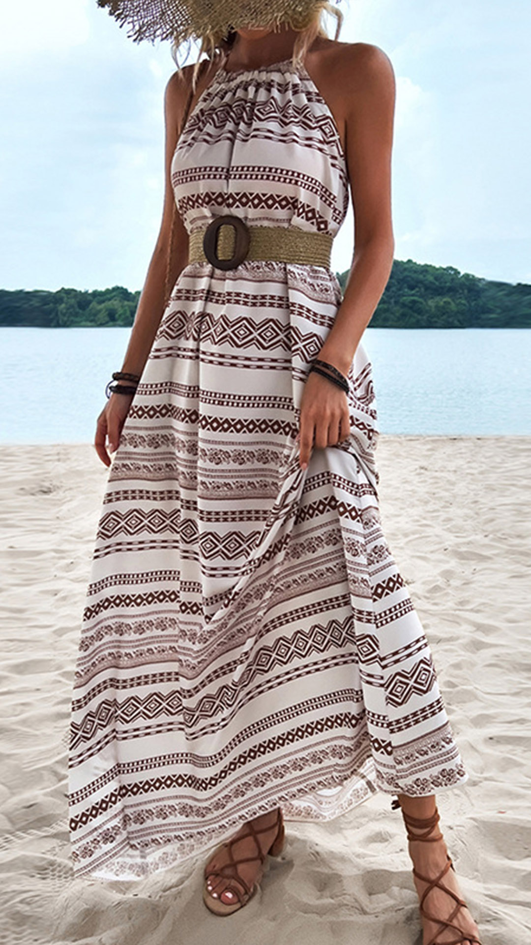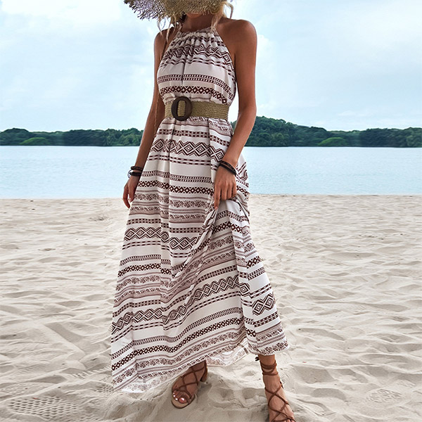 Bohemia Style Floral Printed Backless Halter Maxi Dress