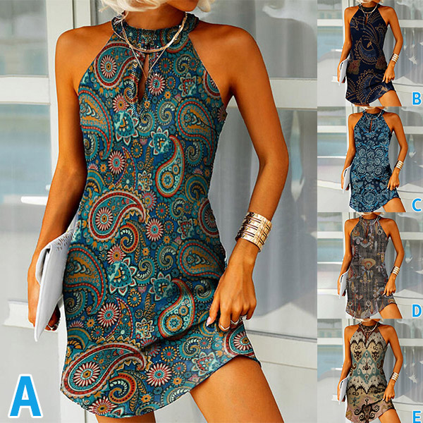 Mini dress featuring overall floral printed, sleeveless, front cut out, halter neck. Made of soft material for comfortable wearing!
