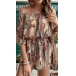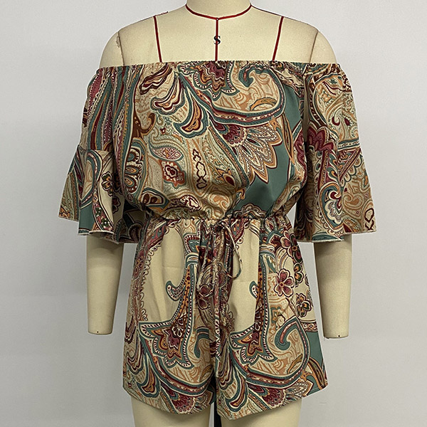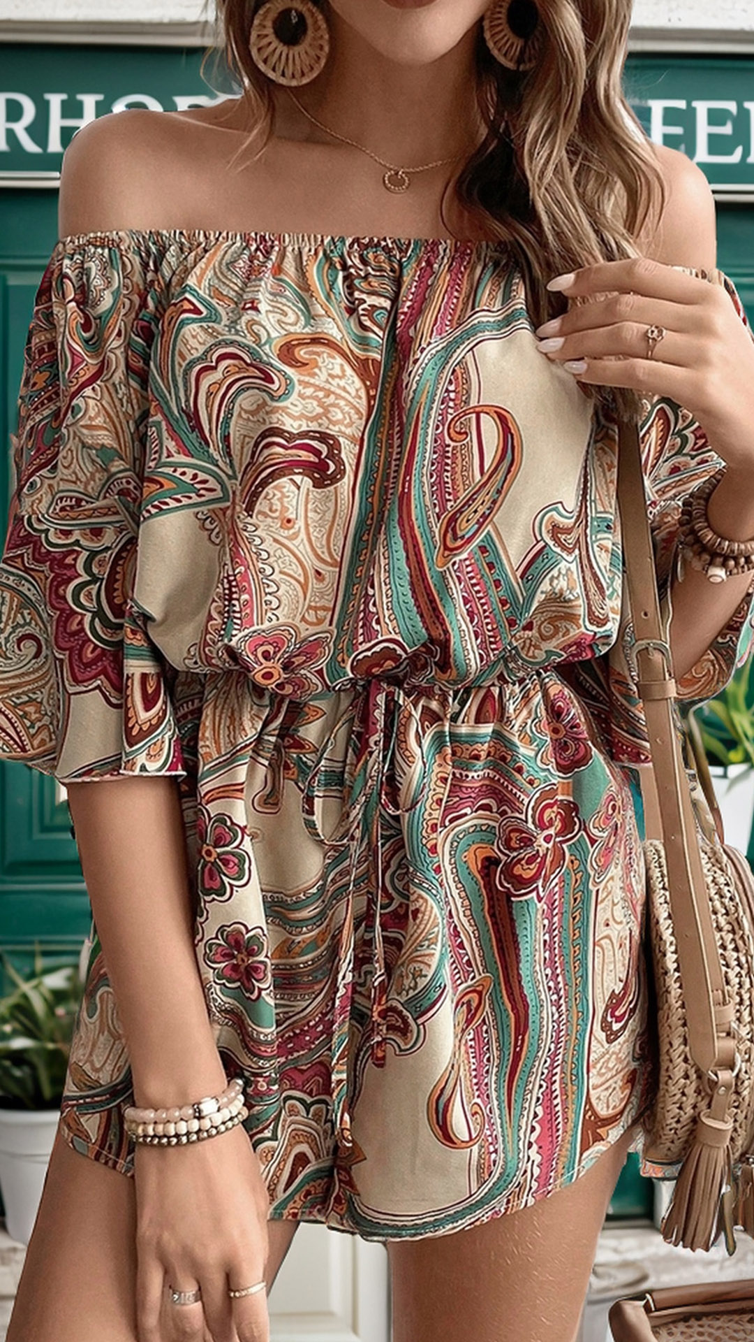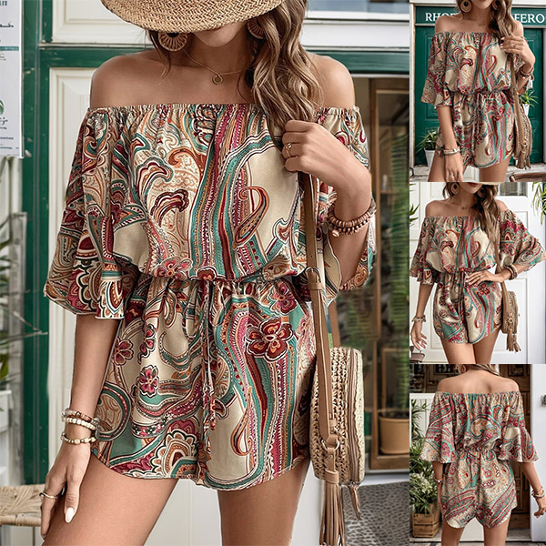 This bohemian-style romper features a vibrant floral print and an off-the-shoulder neckline, perfect for a summer day out. Pair it with sandals and a floppy hat for a laid-back boho look.