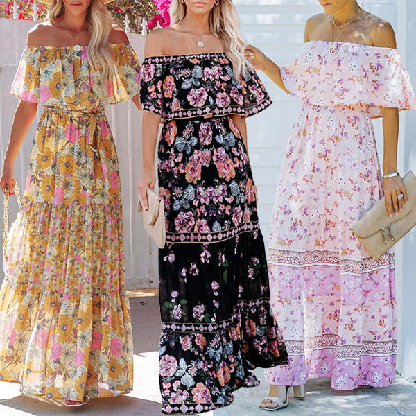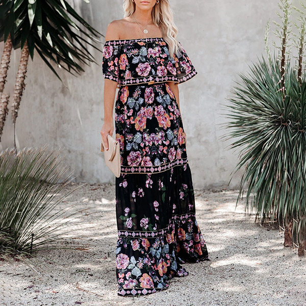 This stunning dress is perfect for a summer day! The bohemia style floral print is beautiful and the off-the-shoulder short sleeves are perfect for keeping cool. The dress is lightweight and flowy, making it perfect for a hot summer day.
