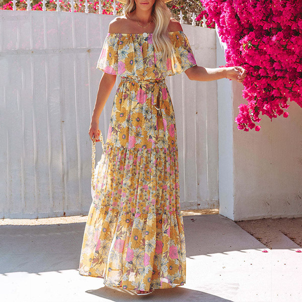 Bohemia Style Floral Printed Off-the-shoulder Short Sleeve Dress