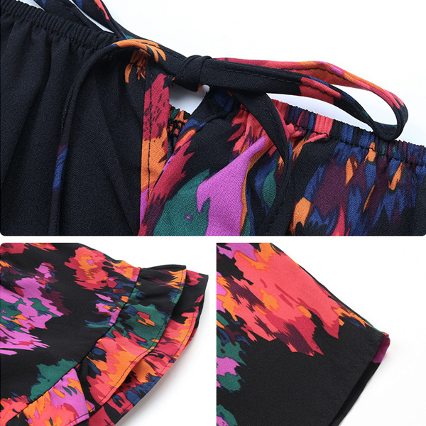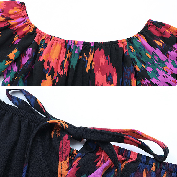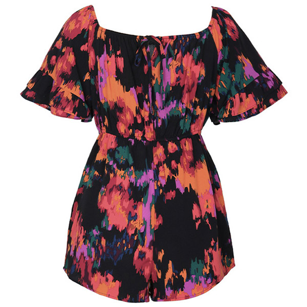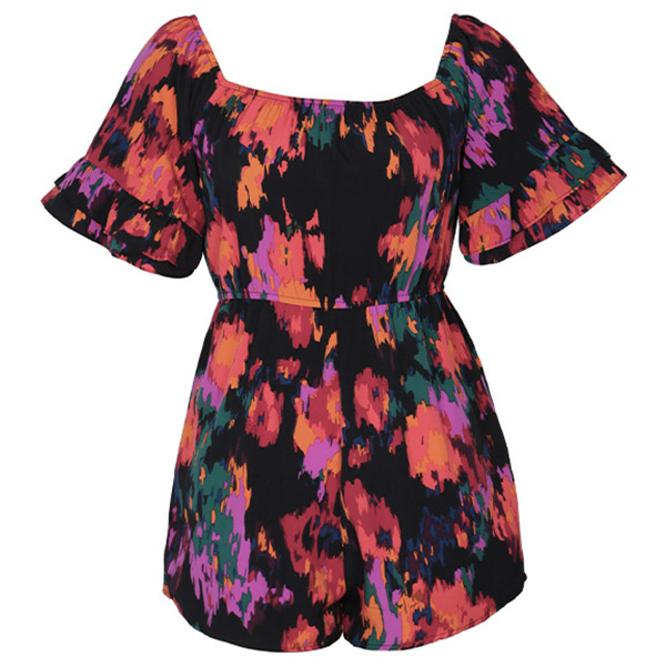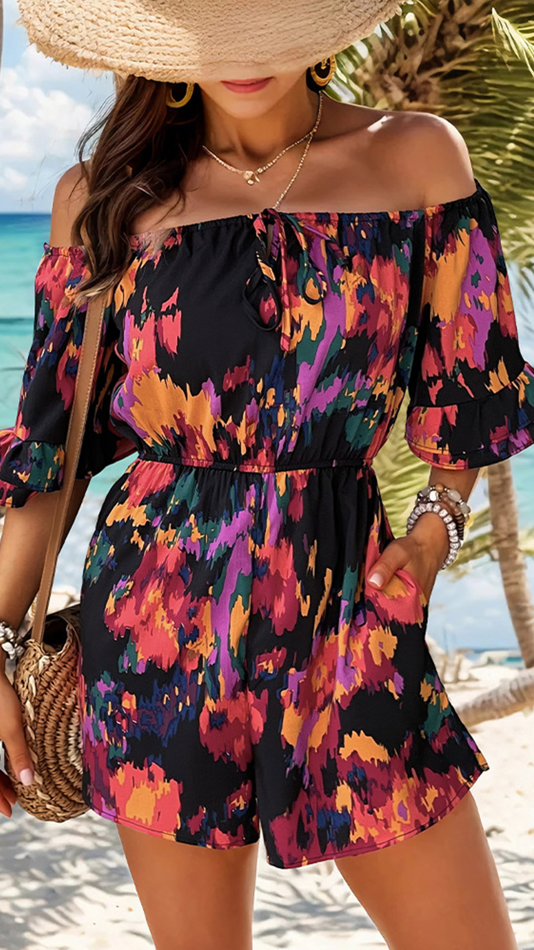 This is a trendy and bohemian-inspired romper that combines a floral print, off-the-shoulder neckline, and short sleeves for a fashionable and free-spirited look.