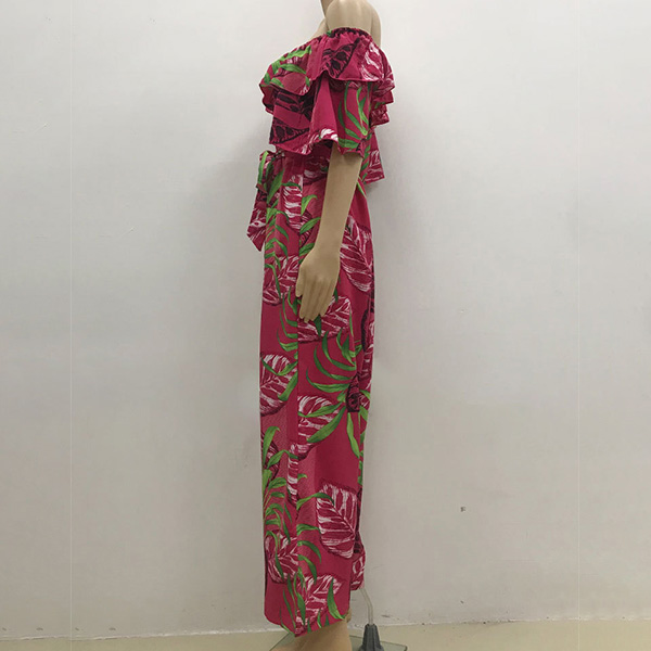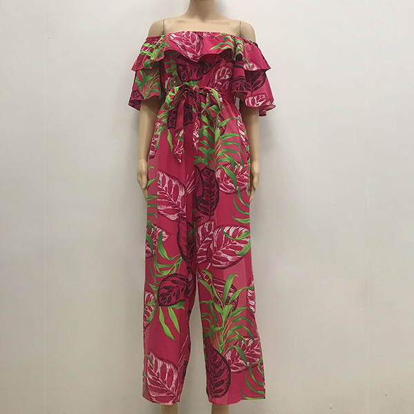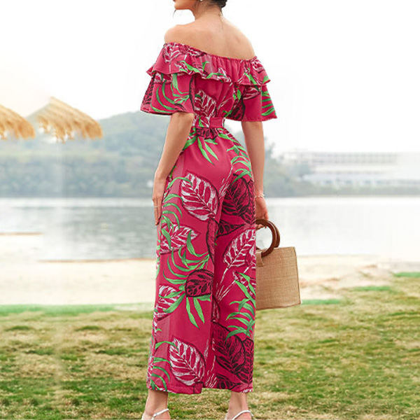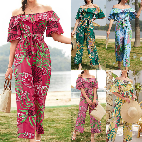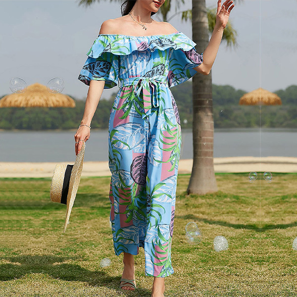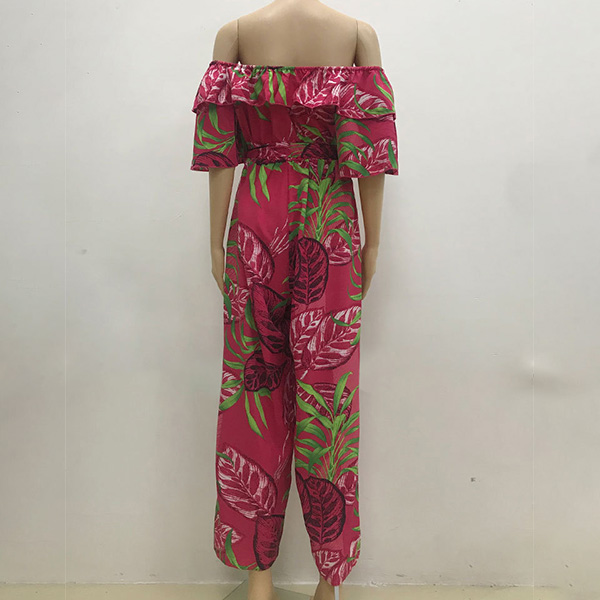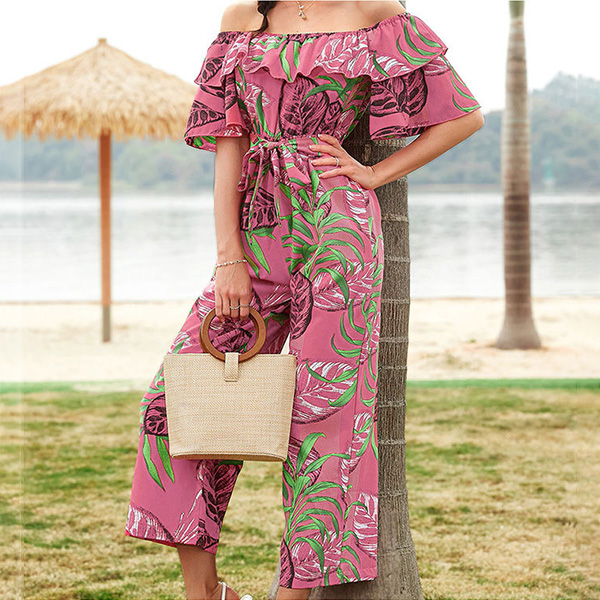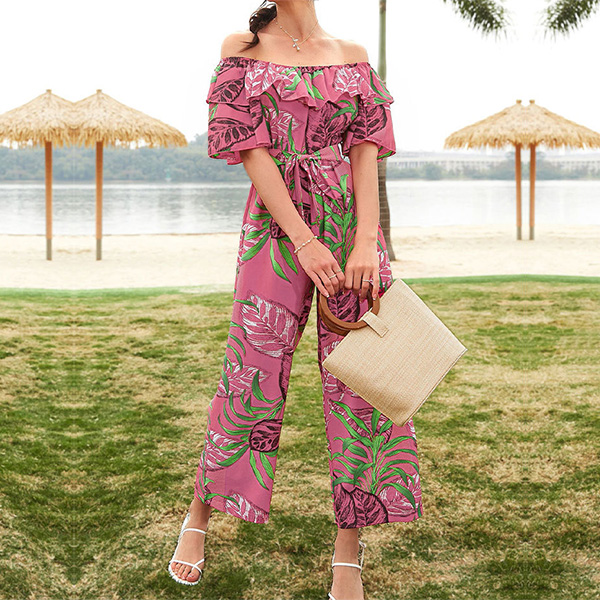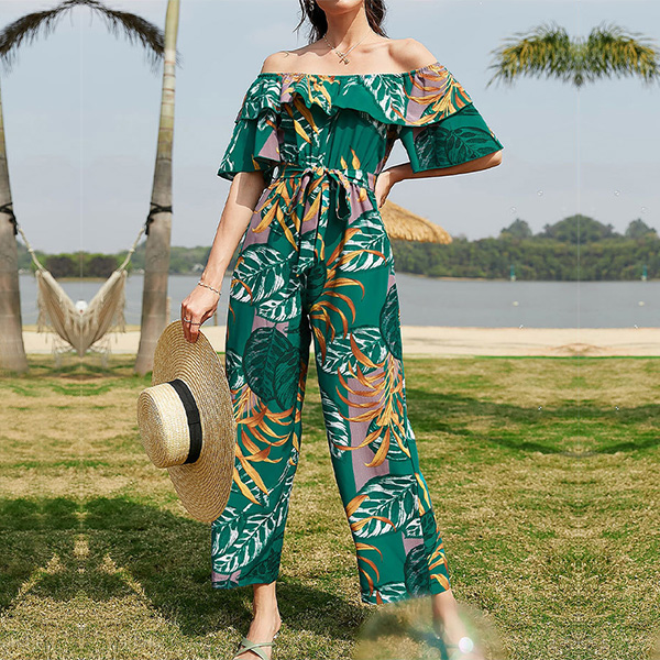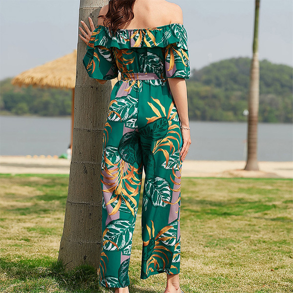 Bohemia Style Floral Printed Off-the-shoulder Short Sleeve Wide-leg Jumpsuit