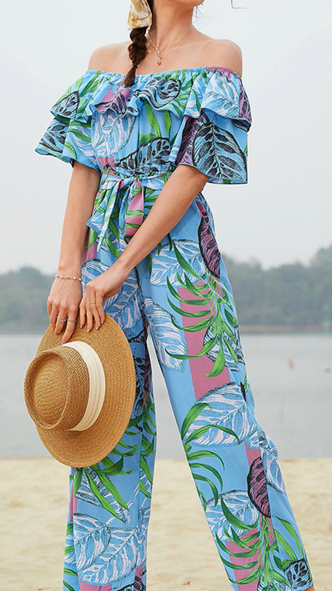 This Floral Printed Jumpsuit is the perfect piece to add a touch of style to any wardrobe. Its unique design features a beautiful floral pattern with an off-the-shoulder neckline, short sleeves, wide-leg and a flattering silhouette that is perfect for any occasion. The lightweight fabric is comfortable and breathable, making it ideal for warm weather days. Wanna have a try?
