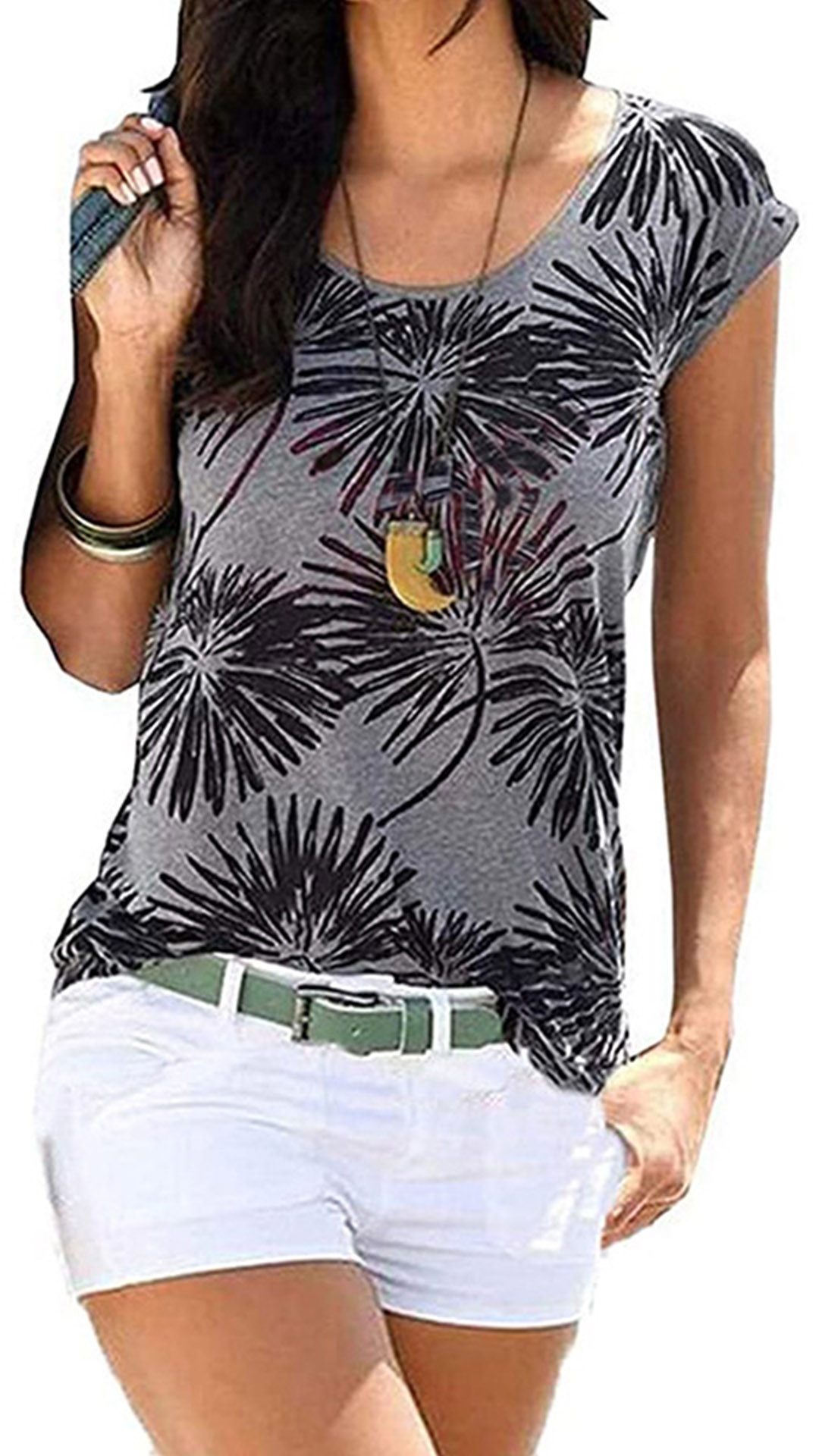This charming and effortlessly stylish shirt features a bohemian-inspired floral print, a round neckline, and cap sleeves, creating a relaxed and feminine look that is perfect for a variety of casual and semi-formal occasions. For a casual, daytime look, pair the shirt with a pair of high-waisted denim jeans or relaxed-fit trousers.