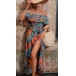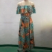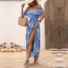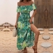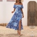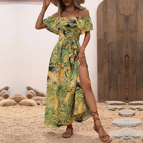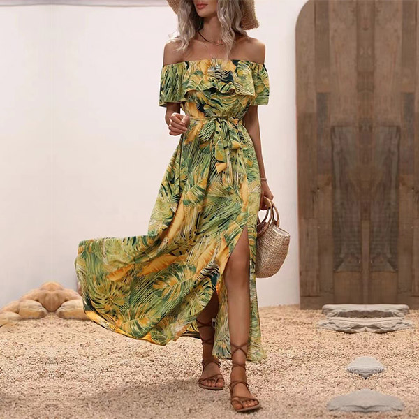 Bohemia Style Floral Printed Ruffled Off-the-shoulder Self-tie Slit Midi Dress