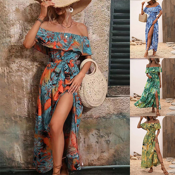 This dress is the epitome of free-spirited fashion, featuring a stunning floral print! And the off-the-shoulder neckline adds a touch of femininity and showcases your shoulders, while the ruffled details add a playful and romantic element to the dress. The self-tie waist allows you to cinch in the dress for a more defined silhouette, enhancing your curves and creating a flattering fit.Pair this dress with sandals or wedges for a casual daytime look, or dress it up with heels and statement jewelry for a boho-chic evening ensemble.