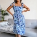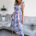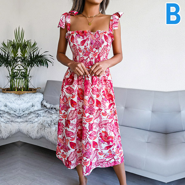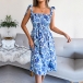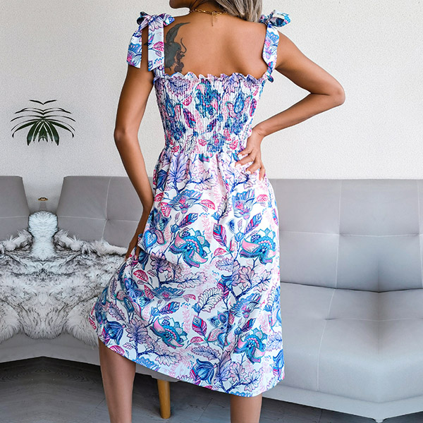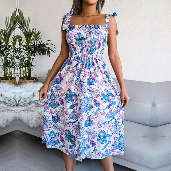 Bohemia Style Floral Printed Tie-strap Smocked Midi Dress