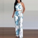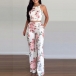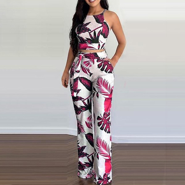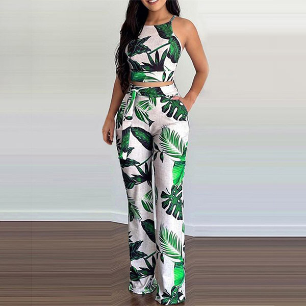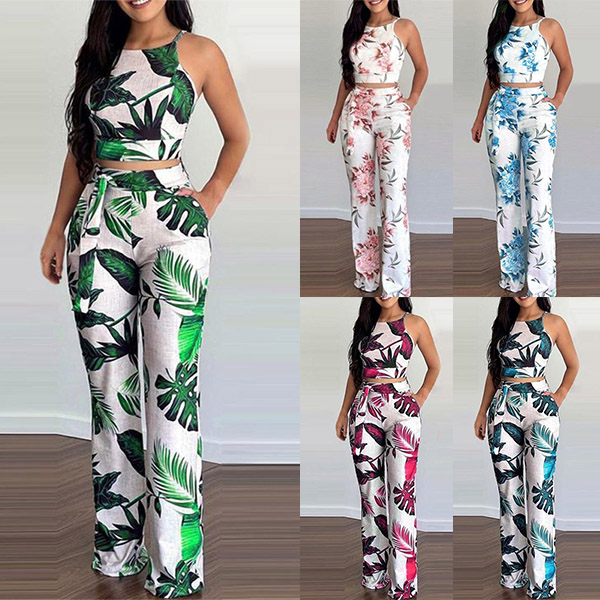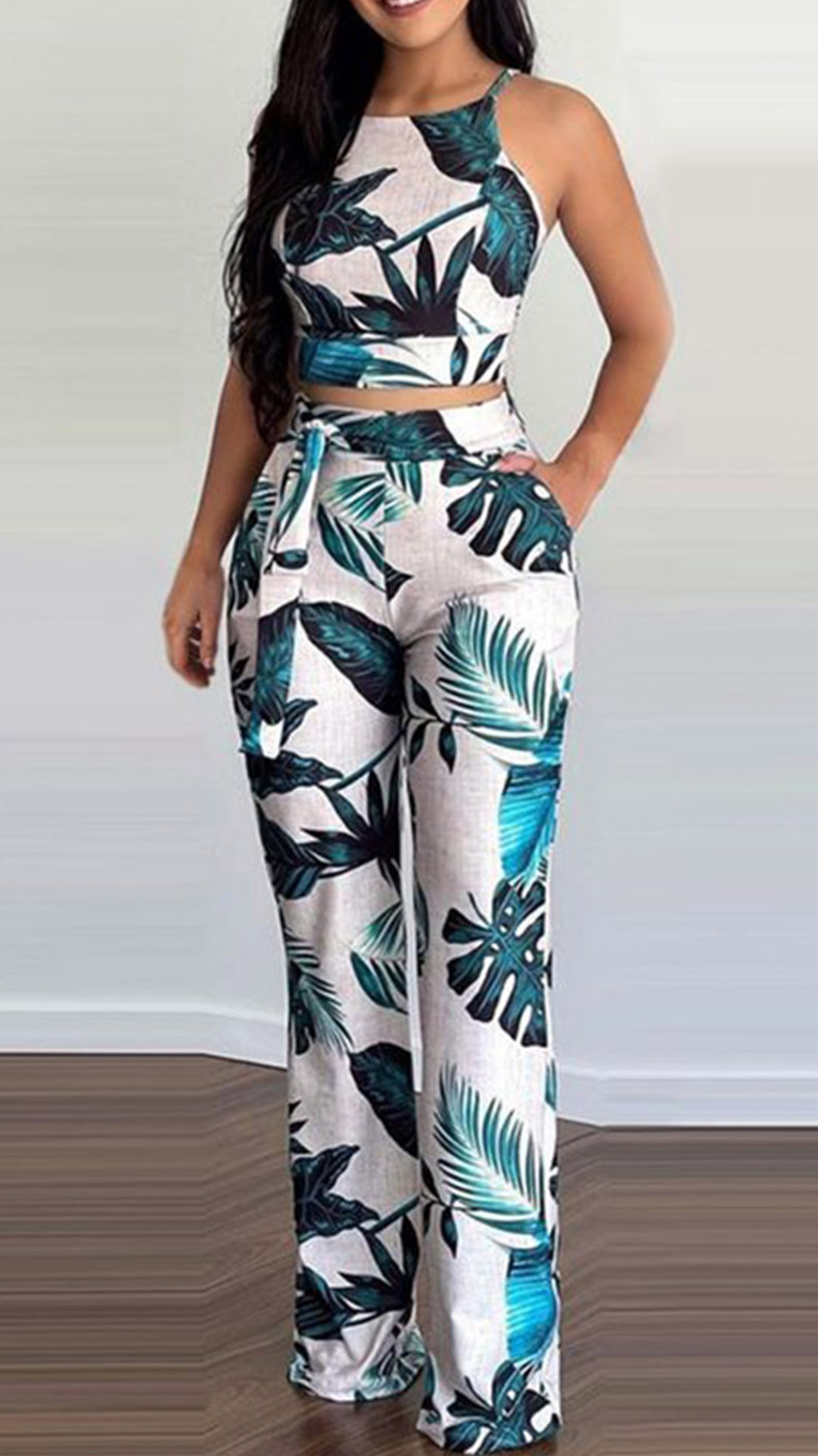 Bohemia Style Floral Printed Two-piece Set Consist of Crop Top and Wide-leg Pants