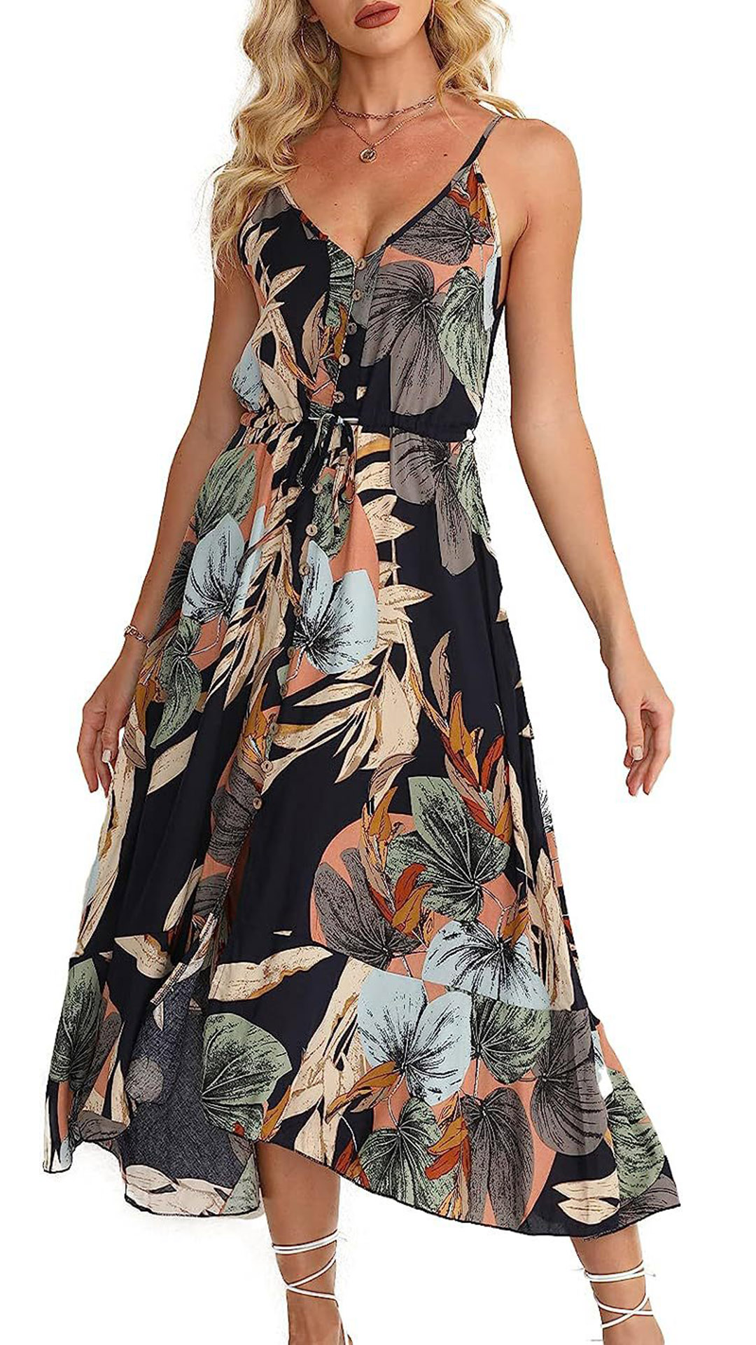 This dress showcases a beautiful floral print, a flattering V-neckline, and button detailing for a charming and free-spirited look.