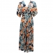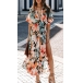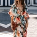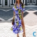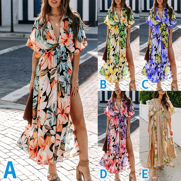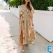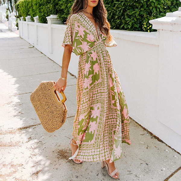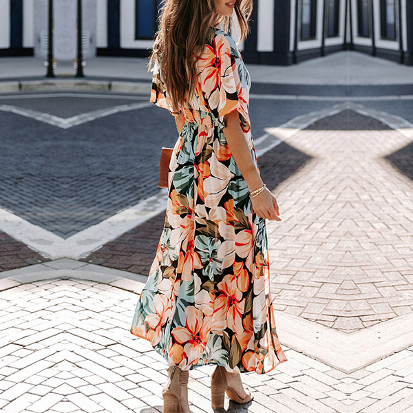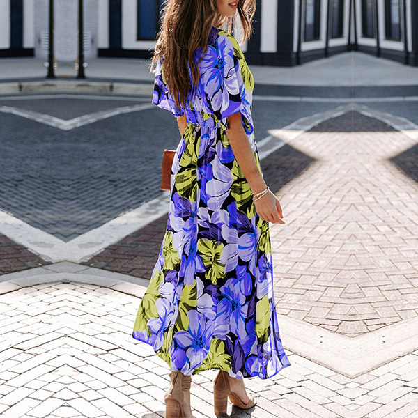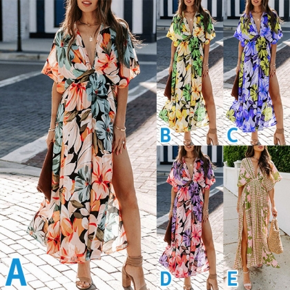 Bohemia Style Floral Printed V-neck Cap Sleeve High-rise Slit Dress