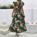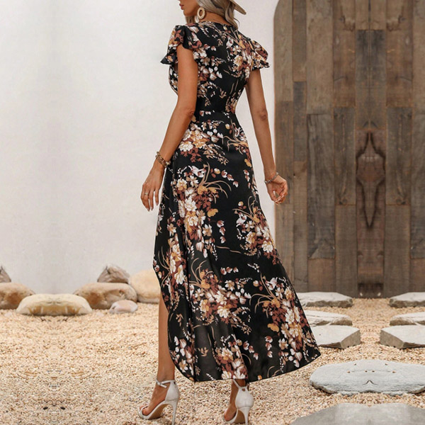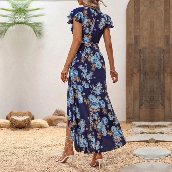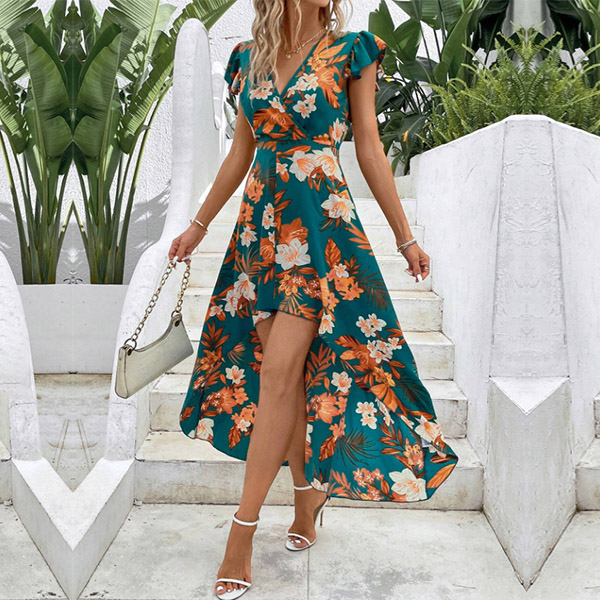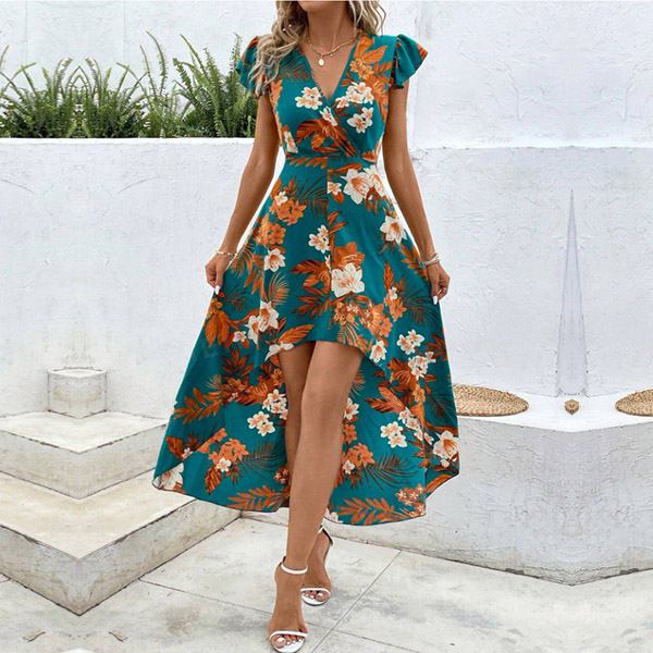 Bohemia Style Floral Printed V-neck Cap Sleeve Irregular Hemline Dress