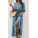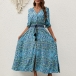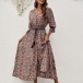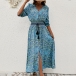 Bohemia Style Floral Printed V-neck Elbow Sleeve Drawstring Slit Summer Dress