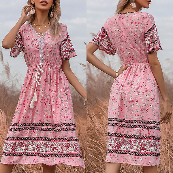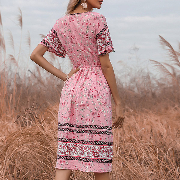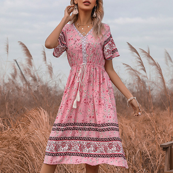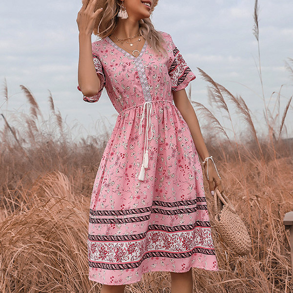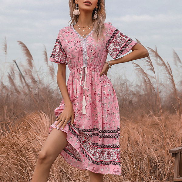 Bohemia Style Floral Printed V-neck Short Sleeve Drawstring Dress