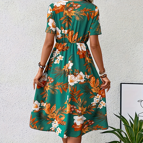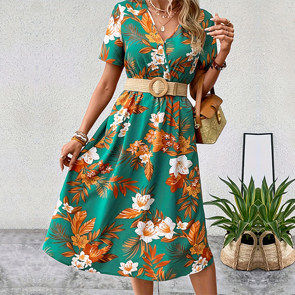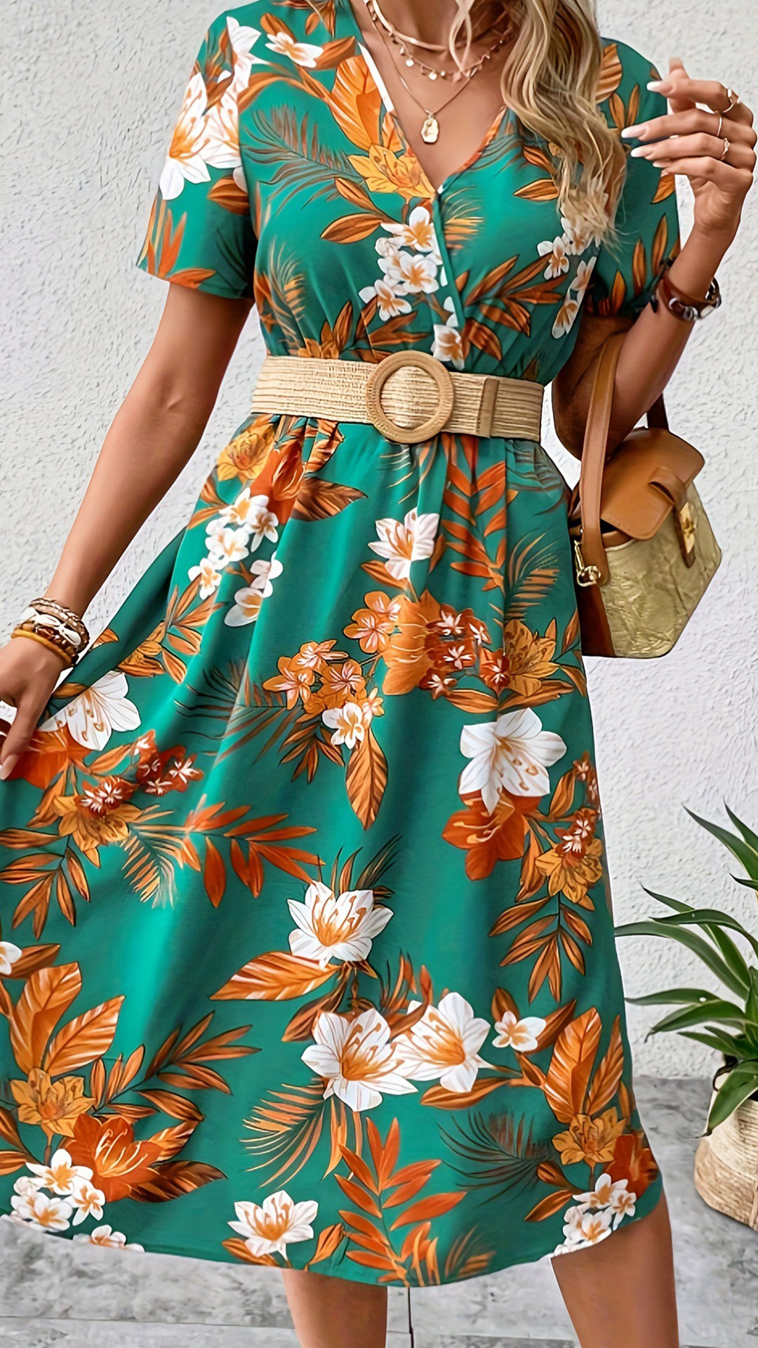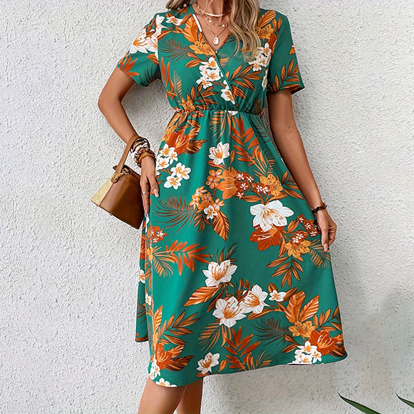 This is a beautiful and vibrant midi-dress that combines a bohemian-inspired design, a floral print, a V-neckline, and short sleeves for a stylish and feminine look. Is it your style?