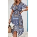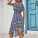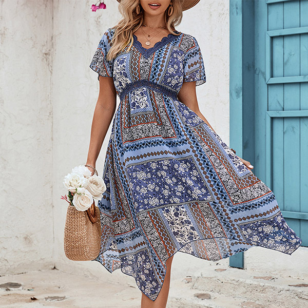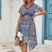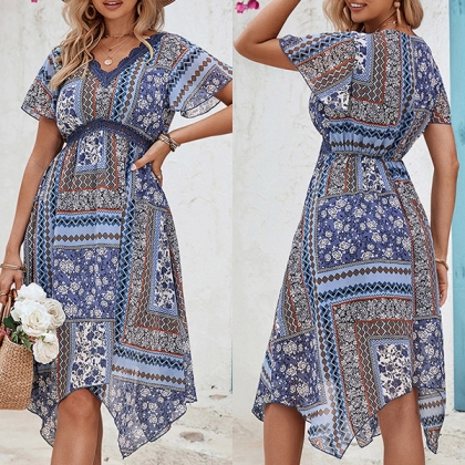 Bohemia Style Floral Printed V-neck Short Sleeve High-rise Iregular Hemline Mini Dress