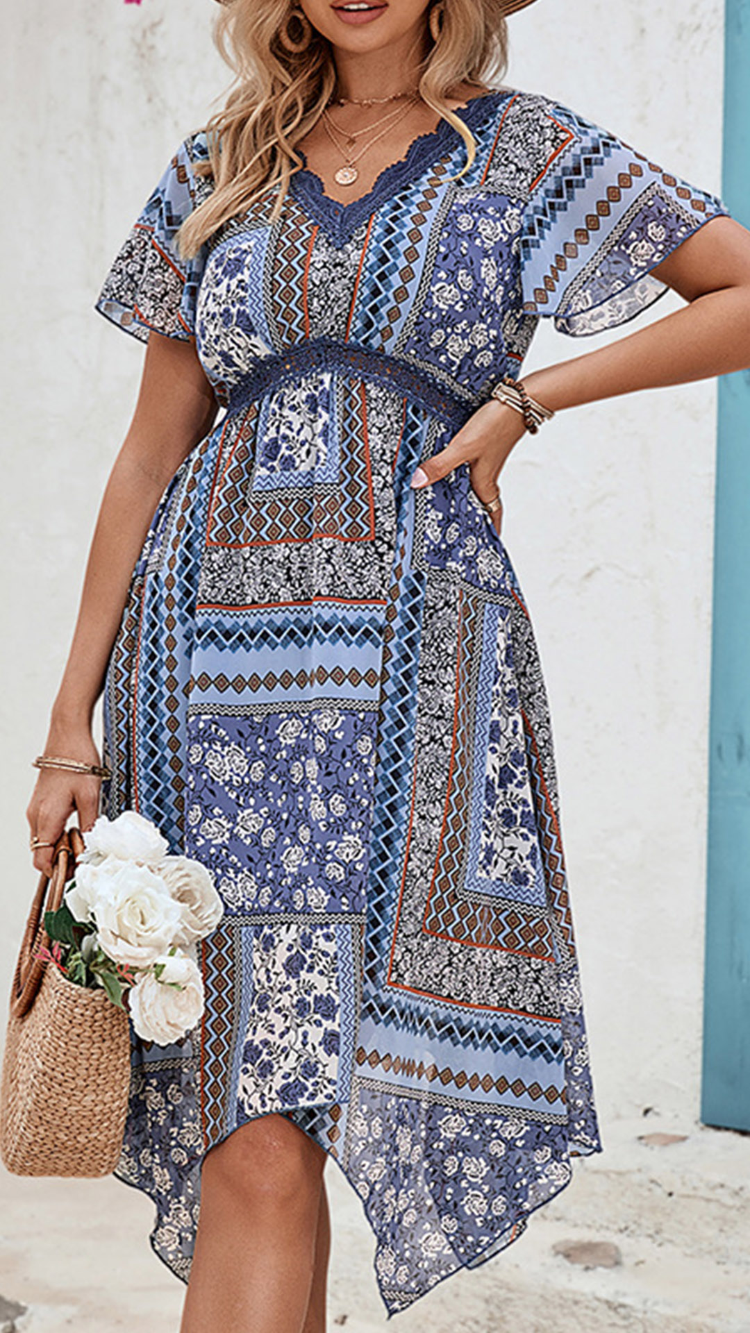 This dress features a whimsical floral print, a flattering V-neckline, short sleeves, a high-rise waist, and an irregular hemline, creating a free-spirited and fashionable ensemble. Pair it with strappy sandals and a wide-brimmed hat for a bohemian-inspired look.