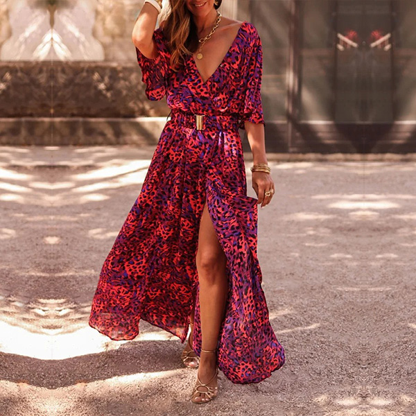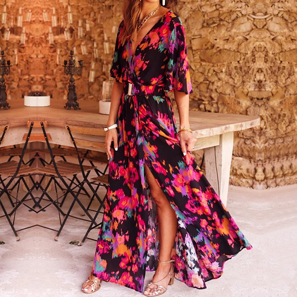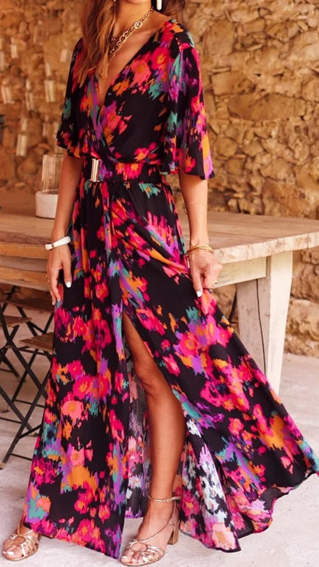 Bohemia Style Floral Printed V-neck Short Sleeve Slit Maxi Dress with Belt