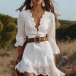 Bohemia Style Lace Spliced V-neck Elbow Sleeve White Dress