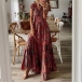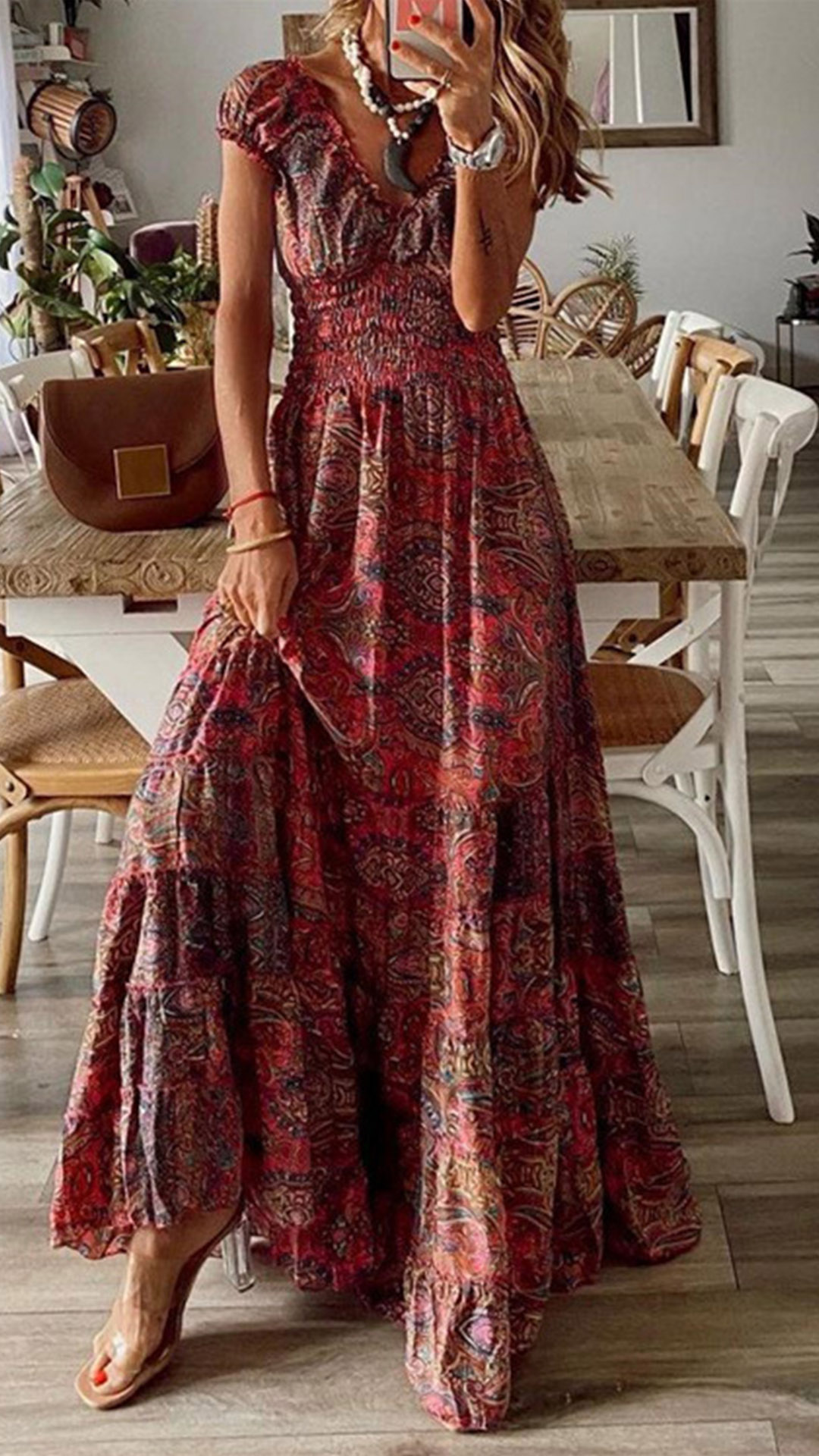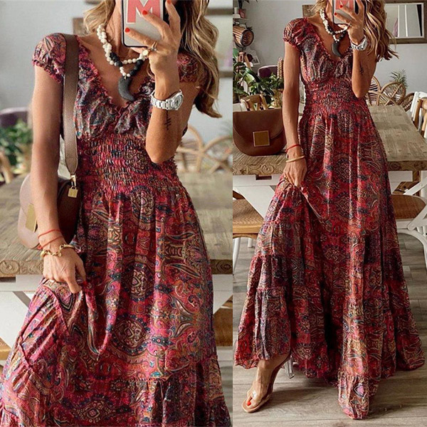 Bohemia Style Paisley Pattern Floral Printed V-neck Short Sleeve Maxi-dress