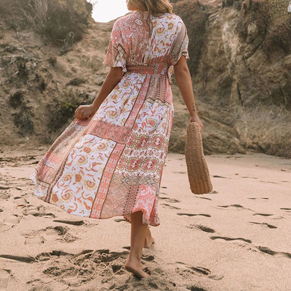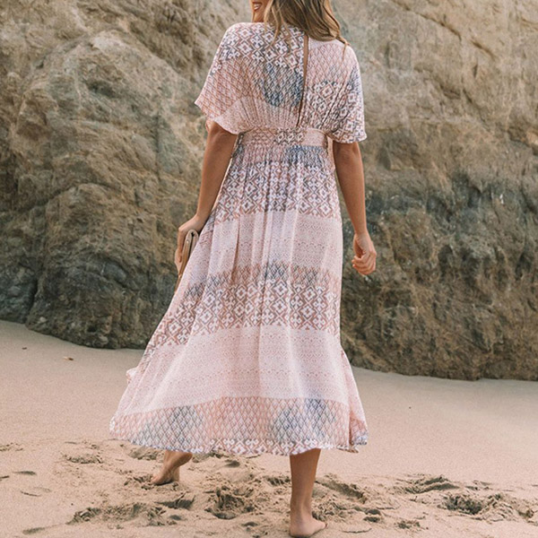 Bohemia Style Plunge V-neck Floral Print Batwing Sleeve Side Slit Summer Dress