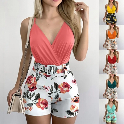 Bohemia Style Two-piece Set Consist of Solid Color Cami Top and Printed Shorts with Belt