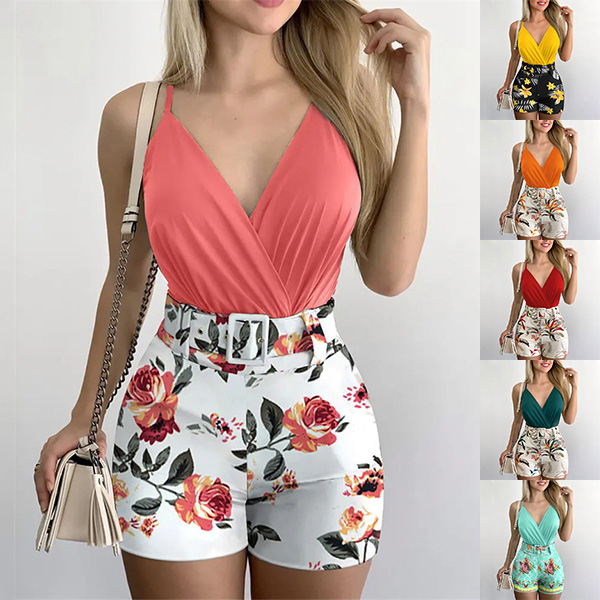 Embrace your free spirit in this bohemian-inspired two-piece set. The solid color cami crop top features a sexy V-neck. The matching high-waisted shorts boast a colorful floral print in turquoise. A matching fabric belt allows you to cinch the waist for an ultra-flattering silhouette. Wanna have a try?
